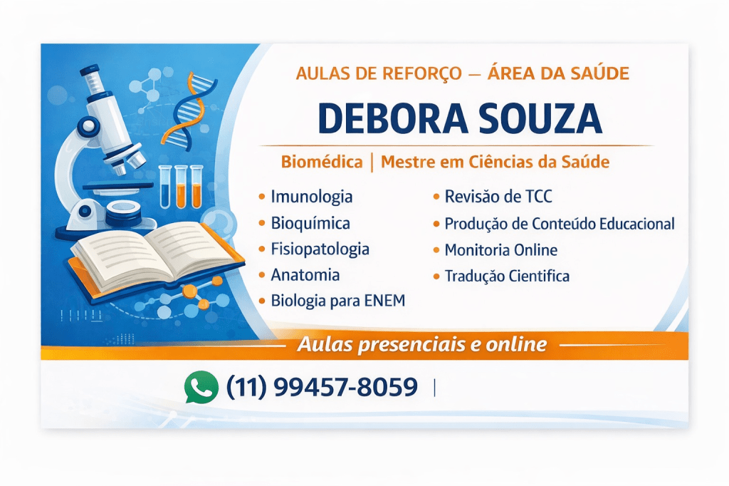 Sou Debora Souza, biomédica e mestre em Ciências da Saúde, e ofereço aulas presenciais e online, com metodologia personalizada e foco em resultados reais.